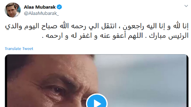 نعى علاء مبارك، نجل الرئيس المصري الأسبق محمد حسني مبارك، والده عبر جملة كتبها، اليوم الثلاثاء، على موقع التواصل الاجتماعي "تويتر"، قال فيها: "إنا لله و إنا إليه راجعون، انتقل إلى رحمه الله صباح اليوم والدي الرئيس مبارك.. اللهم أعفو عنه واغفر له وارحمه".